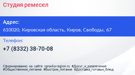 Студия ремесел по адресу 610020, Кировская область, Киров, Свободы, 67 в дальнейшем Организация, размещена в следующих категориях: