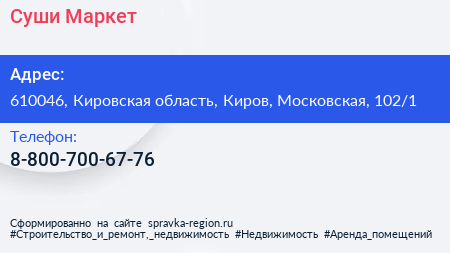 Суши-Маркет по адресу 610046, Кировская область, Киров, Московская, 102/1 в дальнейшем Организация, размещена в следующих категориях: