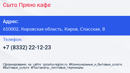 Сыто-Пряно, кафе по адресу 610002, Кировская область, Киров, Спасская, 8 в дальнейшем Организация, размещена в следующих категориях: