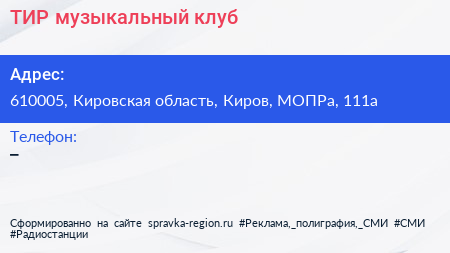 ТИР, музыкальный клуб по адресу 610005, Кировская область, Киров, МОПРа, 111а в дальнейшем Организация, размещена в следующих категориях: