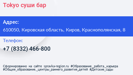Tokyo, суши-бар по адресу 610050, Кировская область, Киров, Краснополянская, 8 в дальнейшем Организация, размещена в следующих категориях: