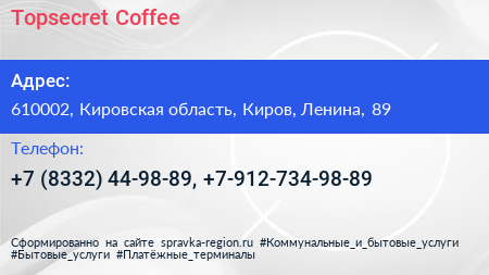Topsecret Coffee по адресу 610002, Кировская область, Киров, Ленина, 89 в дальнейшем Организация, размещена в следующих категориях: