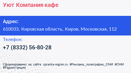 Уют-Компания, кафе по адресу 610033, Кировская область, Киров, Московская, 112 в дальнейшем Организация, размещена в следующих категориях: