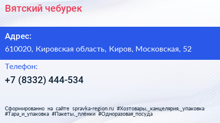 Вятский чебурек по адресу 610020, Кировская область, Киров, Московская, 52 в дальнейшем Организация, размещена в следующих категориях: