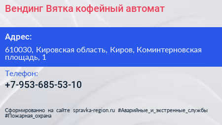 Вендинг-Вятка, кофейный автомат по адресу 610030, Кировская область, Киров, Коминтерновская площадь, 1 в дальнейшем Организация, размещена в следующих категориях: