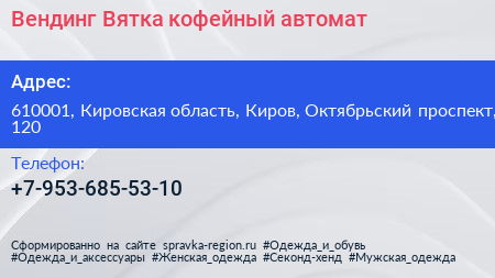 Вендинг-Вятка, кофейный автомат по адресу 610001, Кировская область, Киров, Октябрьский проспект, 120 в дальнейшем Организация, размещена в следующих категориях: