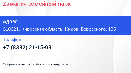 Zамания, семейный парк по адресу 610021, Кировская область, Киров, Воровского, 135 в дальнейшем Организация, размещена в следующих категориях: