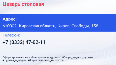 Цезарь, столовая по адресу 610002, Кировская область, Киров, Свободы, 158 в дальнейшем Организация, размещена в следующих категориях:
