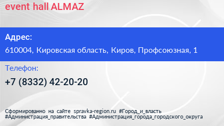 event hall ALMAZ по адресу 610004, Кировская область, Киров, Профсоюзная, 1 в дальнейшем Организация, размещена в следующих категориях: