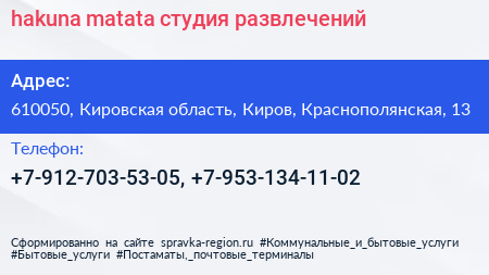 hakuna matata, студия развлечений по адресу 610050, Кировская область, Киров, Краснополянская, 13 в дальнейшем Организация, размещена в следующих категориях: