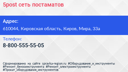 5post, сеть постаматов по адресу 610044, Кировская область, Киров, Мира, 33а в дальнейшем Организация, размещена в следующих категориях: