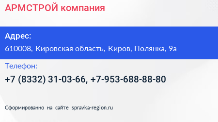 АРМСТРОЙ, компания по адресу 610008, Кировская область, Киров, Полянка, 9а в дальнейшем Организация, размещена в следующих категориях: