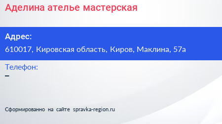 Аделина, ателье-мастерская по адресу 610017, Кировская область, Киров, Маклина, 57а в дальнейшем Организация, размещена в следующих категориях:
