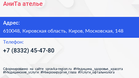 АниТа, ателье по адресу 610048, Кировская область, Киров, Московская, 148 в дальнейшем Организация, размещена в следующих категориях: