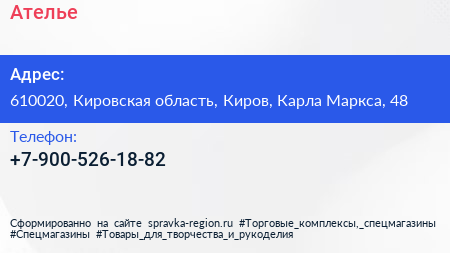 Ателье по адресу 610020, Кировская область, Киров, Карла Маркса, 48 в дальнейшем Организация, размещена в следующих категориях: