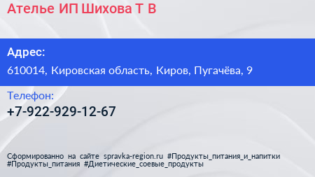 Ателье, ИП Шихова Т.В. по адресу 610014, Кировская область, Киров, Пугачёва, 9 в дальнейшем Организация, размещена в следующих категориях: