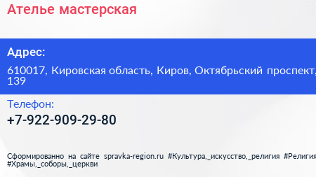 Ателье-мастерская по адресу 610017, Кировская область, Киров, Октябрьский проспект, 139 в дальнейшем Организация, размещена в следующих категориях: