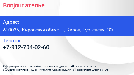 Bonjour, ателье по адресу 610035, Кировская область, Киров, Тургенева, 30 в дальнейшем Организация, размещена в следующих категориях: