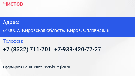 Чистов по адресу 610007, Кировская область, Киров, Сплавная, 8 в дальнейшем Организация, размещена в следующих категориях: