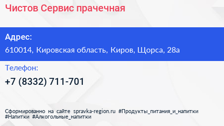 Чистов Сервис, прачечная по адресу 610014, Кировская область, Киров, Щорса, 28а в дальнейшем Организация, размещена в следующих категориях:
