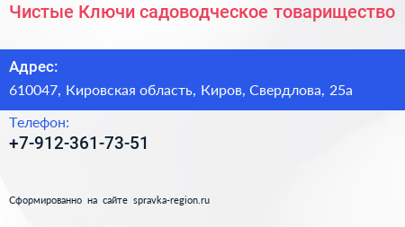 Чистые Ключи, садоводческое товарищество по адресу 610047, Кировская область, Киров, Свердлова, 25а в дальнейшем Организация, размещена в следующих категориях: