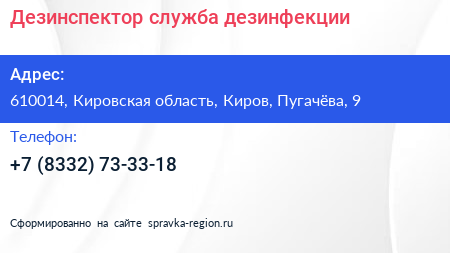 Дезинспектор, служба дезинфекции по адресу 610014, Кировская область, Киров, Пугачёва, 9 в дальнейшем Организация, размещена в следующих категориях: