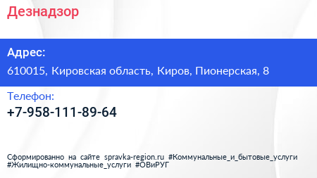 Дезнадзор по адресу 610015, Кировская область, Киров, Пионерская, 8 в дальнейшем Организация, размещена в следующих категориях:
