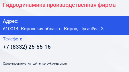 Гидродинамика, производственная фирма по адресу 610014, Кировская область, Киров, Пугачёва, 3 в дальнейшем Организация, размещена в следующих категориях:
