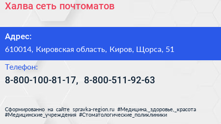Халва, сеть почтоматов по адресу 610014, Кировская область, Киров, Щорса, 51 в дальнейшем Организация, размещена в следующих категориях: