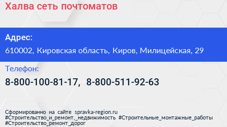 Халва, сеть почтоматов по адресу 610002, Кировская область, Киров, Милицейская, 29 в дальнейшем Организация, размещена в следующих категориях: