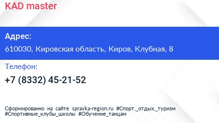 KAD master по адресу 610030, Кировская область, Киров, Клубная, 8 в дальнейшем Организация, размещена в следующих категориях: