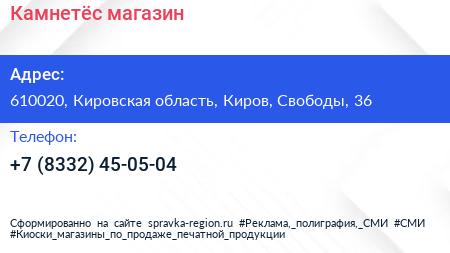 Камнетёс, магазин по адресу 610020, Кировская область, Киров, Свободы, 36 в дальнейшем Организация, размещена в следующих категориях: