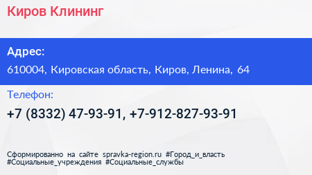 Киров Клининг по адресу 610004, Кировская область, Киров, Ленина, 64 в дальнейшем Организация, размещена в следующих категориях: