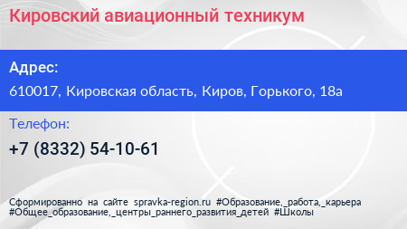 Кировский авиационный техникум по адресу 610017, Кировская область, Киров, Горького, 18а в дальнейшем Организация, размещена в следующих категориях: