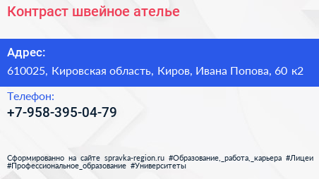 Контраст, швейное ателье по адресу 610025, Кировская область, Киров, Ивана Попова, 60 к2 в дальнейшем Организация, размещена в следующих категориях: