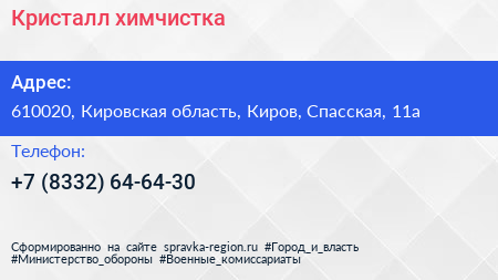Кристалл, химчистка по адресу 610020, Кировская область, Киров, Спасская, 11а в дальнейшем Организация, размещена в следующих категориях:
