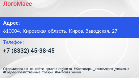 ЛогоМасс по адресу 610004, Кировская область, Киров, Заводская, 27 в дальнейшем Организация, размещена в следующих категориях: