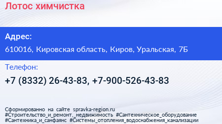 Лотос, химчистка по адресу 610016, Кировская область, Киров, Уральская, 7Б в дальнейшем Организация, размещена в следующих категориях: