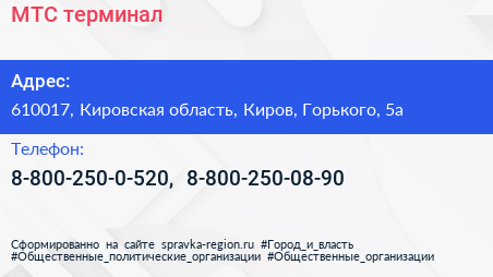 МТС, терминал по адресу 610017, Кировская область, Киров, Горького, 5а в дальнейшем Организация, размещена в следующих категориях: