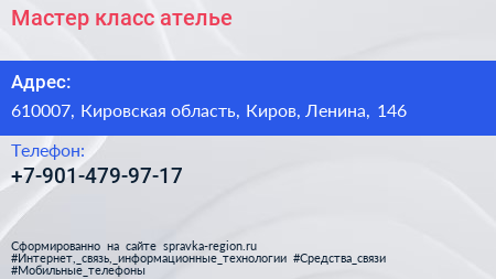 Мастер-класс, ателье по адресу 610007, Кировская область, Киров, Ленина, 146 в дальнейшем Организация, размещена в следующих категориях: