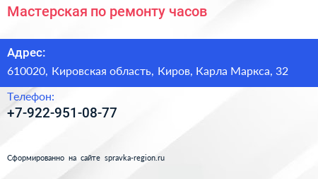 Мастерская по ремонту часов по адресу 610020, Кировская область, Киров, Карла Маркса, 32 в дальнейшем Организация, размещена в следующих категориях: