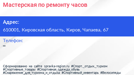 Мастерская по ремонту часов по адресу 610001, Кировская область, Киров, Чапаева, 67 в дальнейшем Организация, размещена в следующих категориях: