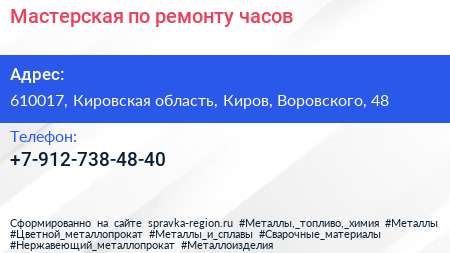 Мастерская по ремонту часов по адресу 610017, Кировская область, Киров, Воровского, 48 в дальнейшем Организация, размещена в следующих категориях: