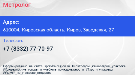 Метролог по адресу 610004, Кировская область, Киров, Заводская, 27 в дальнейшем Организация, размещена в следующих категориях: