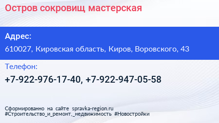 Остров сокровищ, мастерская по адресу 610027, Кировская область, Киров, Воровского, 43 в дальнейшем Организация, размещена в следующих категориях: