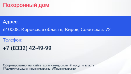 Похоронный дом по адресу 610008, Кировская область, Киров, Советская, 72 в дальнейшем Организация, размещена в следующих категориях: