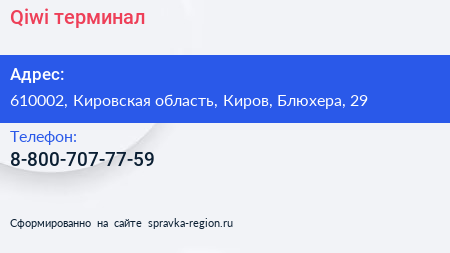 Qiwi, терминал по адресу 610002, Кировская область, Киров, Блюхера, 29 в дальнейшем Организация, размещена в следующих категориях:
