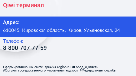 Qiwi, терминал по адресу 610045, Кировская область, Киров, Ульяновская, 24 в дальнейшем Организация, размещена в следующих категориях: