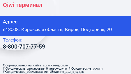Qiwi, терминал по адресу 613008, Кировская область, Киров, Подгорная, 20 в дальнейшем Организация, размещена в следующих категориях: