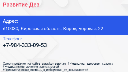 Развитие Дез по адресу 610030, Кировская область, Киров, Боровая, 22 в дальнейшем Организация, размещена в следующих категориях: